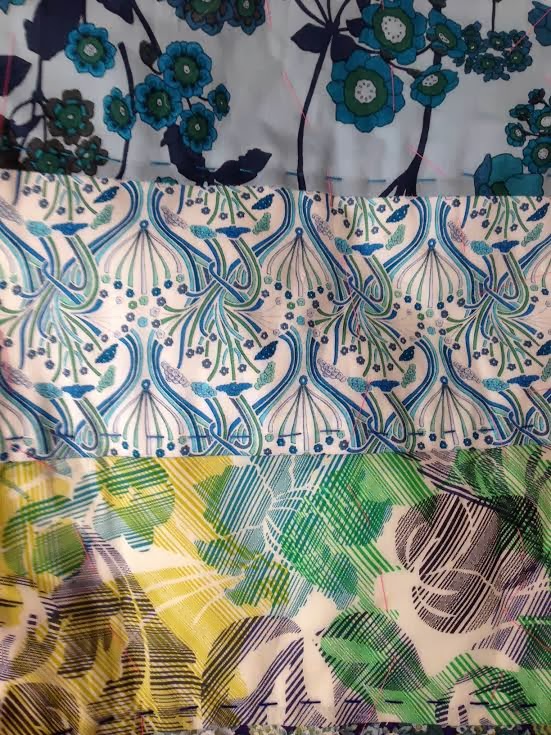 I've put a row of stitching in half the quilt. I'm using 5 different Perle 8 thread colours. I'm stitching each strip of fabric once, then I'm going to review and decide whether to put in more rows of stitching. I've tacked the layers together, which I'm finding easier than negotiating pins, but a bit more time consuming in the preparation-to-quilt stage. I've had abandoned the hoop and I'm not missing it one little bit. I found it to awkward and cumbersome and moving it all the time, well hats off to those of you that have that patience! It sure ain't me! Partly because so far I've used fairly big stitches and I like to just get on with a whole row. I'm too clumsy with the hoop and don't get any rhythm up. I like rhythm. My hand quilting feels absolutely melodic in a very organic kind of way.